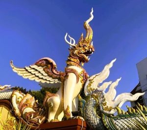 Die Löwenskulpturen, inspiriert von der Architektur des Lanna-Königreichs, stehen Wache an der strahlend weißen Pagode und verankern zugleich das Fundament des Wat Muen Tum (auch: Wat Muen Toom) in Chiang Mais Altstadt. Das historische Juwel reicht zurück bis ins Jahr 1478, als König Mueang Kaeo, der 11. Monarch der verehrten Mangrai-Dynastie das Lanna-Reich regierte.