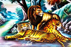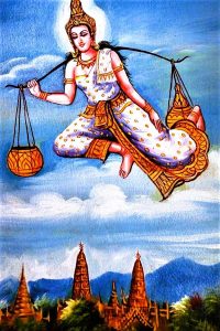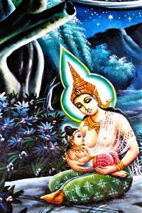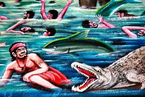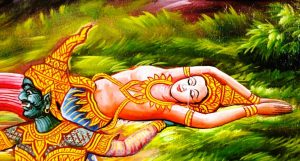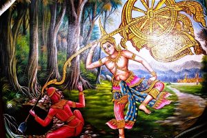 Die Rolle des Schurken in der Erzählung gebührt dem alten Brahmanen Jujaka. In einem der Motive sitzt er auf einem Baum und wird von einem Jäger und dessen Hunden bedroht. Raubtiere, Engel und andere mythische Wesen komplettieren das mörchenhafte Szenario an den Wänden des Wat.