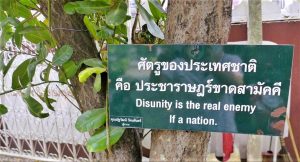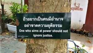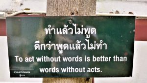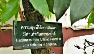Sinnsprüche zieren die Bäume in vielen buddhistischen Tempelanlagen Thailands. Manche Weisheiten könnten auch in westlichen Kalendern von den Wänden grüßen, andere schaffen es nicht über die Hürde der Banalität. Ausnahmen geben zu denken: Das Glück erfüllter Wünsche ist auch nur verkleidetes Leiden. Da können wir ja beruhigt alle Hoffnung fahren lassen.