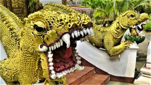 Der Ubosot, das heiligste Bauwerk jeder buddhistischen Tempelanlage und Schauplatz aller wichtigen Zeremonien, wird von zwei fein gearbeiteten, krokodil- oder waranähnlichen Figuren bewacht.