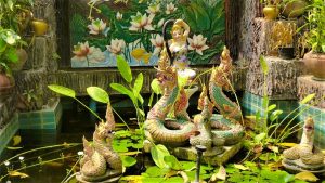 Die Wandmalereien im Viharn, der zentralen Tempelhalle, illustrieren farbmächtig die Vessantara Jātaka, eine der beliebtesten Erzählungen über die früheren Leben Buddhas bis hin zu der Zeit, in der er unter dem Bodhi-Baum saß, vor sich seine stetig wachsende Schülerschar.