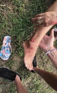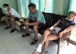 Nötig war das nicht. Ich hätte das sandige, geröllige, steile Stück nicht hochfahren müssen. Nicht mit meiner Frau Toey auf dem Rücksitz. Der Unfall verlief relativ glimpflich, für meine Frau jedoch äußerst schmerzhaft. Wir hatten Glück. Am Thong Nai Pan Yai Beach fanden wir nur eine halbe Stunde später eine erfahrene und bestens ausgebildete Krankenschwester. An einem Sonntag. Danke für den sonntäglichen Einsatz der Schwester und die Erinnerung daran, dass Koh Phangans nicht überall asphaltierte Serpentinen, Hänge und Anstiege immer auch höchste Aufmerksamkeit erfordern.