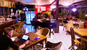 Wer von der Straße zum Rezeptionstresen geht, lässt auch den geringten Lärm hinter sich und entert den Ort, in dem gefrühstückt und, in dem digitale Nomaden mit aller Welt kommunizieren. Der Blick aus dem nach zwei Seiten offenen Raum trifft auf gemütliche Sitzecken nahe dem träge vorbeiziehenden Wang-Fluss, auf den kleinen Garten oder den Wang-Fluss am Abend.