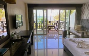 Die Fotos im Netz gefielen mir, die Bewertungen anderer Hotegäste auch. Der Preis lag umgerechnet knapp über 30 Euro. Da habe ich es halt gebucht, das Pattawia Resort & Spa in Pranburi, etwa 20 km südlich von Hua Hin. Was man selbst auf unseren Bildern nicht erkennen kann, ist die Straße zwischen Hotel und Meer, das ist nicht so ungewöhnlich. Was auf unseren Bildern ebenfalls nicht zu erkennen ist: Auch jenseits der Straße gibt es keinen Strand. Da war bei Ebbe nur ein Gezeitentümpel, durch den man zu einer Sandbank schwimmen konnte. Es soll mal einen Strand gegeben haben. Wo ist er hin? Weggeschwemmt? Erodiert? Bei Nacht geklaut von den berüchtigten Stranddieben? Letztlich fiel auch der fehlende Strand nicht weiter ins Gewicht. Denn bei Temperaturen um die 40 Grad war es draußen eh` zu heiß, um barfuß über Sand zu laufen.