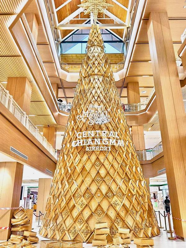 Dieser Weihnachtsbaum aus Bambus steht im Einkaufszentrum Central Airport in Chiang Mai. Er entstand in einer Zusammenarbeit der Architektur-Fakultät der Universität Chiang Mai mit VASSANA, der thailändischen Handwerksmarke für Bambusarbeiten. Deren Sitz ist Chiang Mai, sie verbindet traditionelle Techniken mit modernem Design.