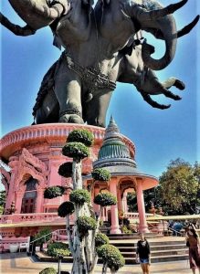 Ein Blick zurück auf meine kürzliche Woche in Bangkok. Das Erawan Museum im Vorort Samut Prakan ist schwer zu verfehlen. Oben thront, 29 Meter hoch und 250 Tonnen schwer, der größte Elefant der Welt mit drei Köpfen. Bedeckt mit 300.000 Kupferplättchen, womit das Gebäude auch das größte Kupfermuseum der Welt ist. Gibt es heute überhaupt noch Sehenswürdigkeiten, die nicht auf einen Eintrag im Guinness-Buch der Rekorde schielen? Abgesehen davon, dass ich die Kupferplättchen mit bloßem Auge nicht einmal erkennen konnte.