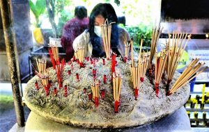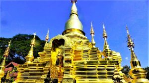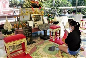 Meine Frau findet Halt im buddhistischen Glauben, das ist ihre Bastion. Für ihre Gebete zum Jahreswechsel wählte sie den Wat Chaimongkol in Chiang Mai. Die buddhistische Stätte im Mon-burmesischen Stil steht am Ufer des Ping River und wird gerade an einigen Stellen renoviert. So “kauften” wir mit einer kleinen Spende (20 Baht) je einen Ziegel und beschrifteten ihn mit Wünschen für Familie und Freunde, damit sie eingemauert und Teil des Tempels werden können. Die Wünsche und die Ziegel, nicht die Adressaten.