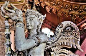 Der Hinweis auf das Erawan-Museum ist wichtig und man kann dort auch ein kleines Buch mit vielen Infos kaufen. Warum machen aber alle so verschämt einen Bogen um die vielen, ausgesprochen erotischen Darstellungen und Malereiern (Treppenaufgang) in diesem wunderbaren Gebäude? Nirgendwo habe ich das so gesehen, wie ich es fotografiert habe. Poetisch und ästhetisch, aber lustvoll…
