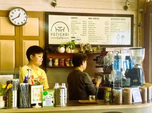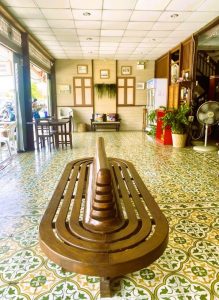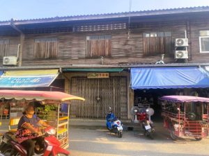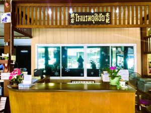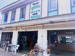 Kurz nach dem Einchecken in unserer Unterkunft wanderten wir zurück in Richtung Bahnhof, denn uns gefiel die dorthin führende Kong Kiat Straße so gut mit ihren alten Häusern, fast alle vor 1970 gebaut. Und das Yuttichai-Hotel steht dort, eins der letzten aus Holz gebauten Hotels in der Region, wo der geneigte Gast noch immer für 350 Baht sauber, auf einem Kingsize Bett und mit Ventilator übernachten kann. In der kleinen Cafeteria des Hotels machten wir Pause, um erst einmal anzukommen.