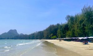 Meine Lieblingsstrände sind normalerweise mit Inseln verbunden. Weicher Sand mit der Häuserfront einer Stadt im Rücken, das ist für mich nur das halbe Vergnügen. Es gibt Ausnahmen, aber das sind Mythen: Copacabana, Ipanema, Leblon in Rio de Janeiro. Zu den Ausnahmen zählt nun auch der Strand der Ao Manao Bucht in Prachuap Khiri Khan. Zumindest gefühlt hat er keine Stadt im Rücken, sondern Pinien und andere Bäume und dahinter eine Militärbasis. Dazu später mehr.