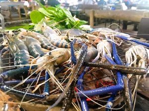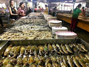 Ende Juli, die Bar war wegen zwei hoher buddhistischer Feiertage geschlossen, nutzten wir die Zeit zu einem Meeresfrüchte-Gelage. Das relevante Büffet kostet 500 Baht pauschal, ca. 12,50 Euro pro Mund. Die Tigergarnelen, Muscheln, Fische etc. schmeckten vorzüglich. Allein die Austern geben mir heute noch Pfötchen.