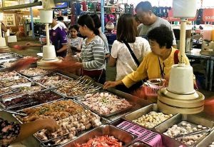 Bis zu diesem Tag kannte ich das Restaurant nicht. Es hat die Größe eines Oktoberfestzeltes und zieht inzwischen auch chinesische Touristen an. Sie kommen mit Bussen. „All you can eat“ ist eine Formel, die von Chiang Mais Gastronomen nur noch mit Vorsicht benutzt wird, wenn Chinesen in der Nähe sind. In den ersten Jahren des Chinesen-Booms waren die Wirte froh, wenn zum Ende noch Reste vom Besteck da waren. Werfe mir keiner Rassismus vor, ich stelle nur fest.