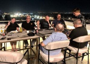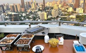 Beim Wiedersehen in Fahris Penthaus (45. Stock) stellten alle Teilnehmer fest, dass persönliche Begegnungen jeden Vergleich mit Zoom-Meetings gewinnen, bei denen es weder kaltes Singha-Bier gibt noch das typisch thailändische Arrangement von Kartoffelsalat, Nudeln, Roulade und Schweineschnitzel (gesponsert von Hartwig Schüler).