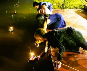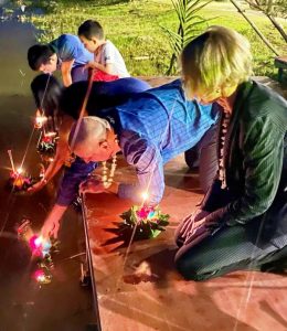 Für Barbara, meine Kollegin aus München, war es bei ihrem ersten Thailand-Besuch gleich auch das erste Fest der schwimmenden Lichter. Sie staunte nicht schlecht, als unser Freund Niall bei seinem Versuch, das Gesteck auf die Wellen zu zu setzen, fast in diesen versunken wäre.