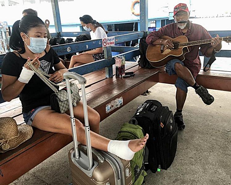 Unser Trip endete mit einem Zweirad-Unfall auf Geröll bei niedriger Geschwindigkeit und großen Schmerzen meiner Frau. Glücklicherweise hatte eine selbständige Krankenschwester ihren Service geöffnet im Dorf nahe dem Strand Thong Nai Pan Yai, sodass Toey eine kompetente Erstbehandlung bekam. Zum Abschied gab es am Pier von Koh Phangan ein Ständchen.