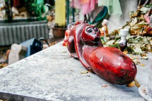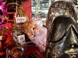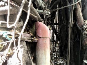 Nach längerem Herumirren fand ich endlich endlich den Schrein. Der war einst ein normales Geisterhäuschen, das der erfolgreiche Geschäftsmann Nai Lert im benachbarten Kanal Saen Saeb entdeckt und herausgefischt hatte. Was erwartete ich nun? Stolze, holzgeschnitzte Phalli in aufgeregter Stimmung, die auch optisch ihrem Ruf gerecht wurden, Glück, Wohlstand und Fruchtbarkeit zu verheißen. Solche Bilder hatte ich im Kopf, gesehen zuvor in diversen Medien.