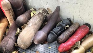 Das alles muss sich lange vor meinem Besuch abgespielt haben. Denn ich traf ein Szenario an, das von Verwahrlosung zeugte und nicht von Glück, Erfolg oder Fruchtbarkeit. Abgesehen vielleicht von einem blank geputzten Penis, der auf einer Rampe auf seinen Einsatz wartete. Seine Kollegen hatten sich im Schatten zusammengerottet; einige standen, viele lagen und ähnelten Blindgängern aus einem verlorenen Krieg. Klammheimlich hatte sich gar ein Vibrator in die Holzarmee geschmuggelt und kündete vom Zeitalter der Maschinen, die Menschen ersetzen können.