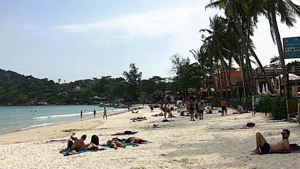 Wir fuhren mit dem Songthaeo, einem zweireihigen Sammeltaxi, zum Strand Haad Rin West. 1,2 Kilometer lang und bereits bekannt für seine Vollmond-Parties.
