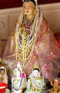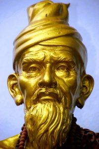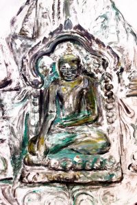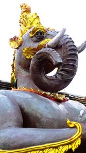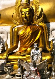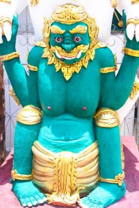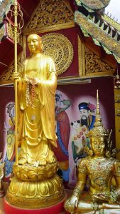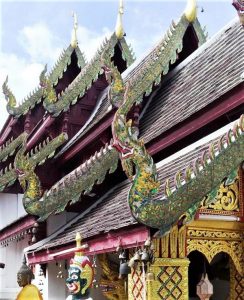 Nicht nur der Eingang zum Tempelinneren wird von mythischen Gestalten bewacht; auch in der Anlage sahen wir viele mit Schwertern bewaffnete Wächter, wie wir sie auch im Grand Palace von Bangkok gesehen haben. Das Innere ist gar nicht so groß, doch es gibt kaum einen Tempel in Chiang Mai mit einem derart vielen, unterschiedlichen Bildern, Statuen, Gongs, Skulpturen, Miniaturen. Als die goldene Pagode 1966 nach heftigen Regenfällen einstürzte, fanden die Besucher im beschädigten Bau zuvor unentdeckte Buddha-Bilder. Die Pagode wurde mit Spendengeldern wieder aufgebaut.