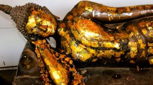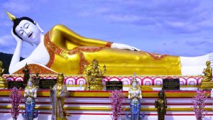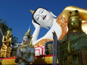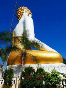 Den Erleuchteten gibt es im Wat Doi Kham in allen Lebenslagen: sitzend, stehend und auch liegend. Auch der liegende Buddha ist riesig und nicht nur deswegen beliebtes Fotomotiv.