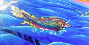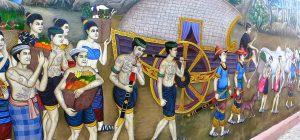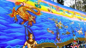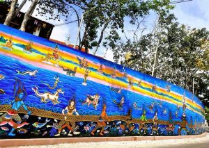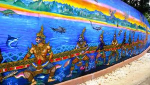 Legendäre, historische Szenen kleiden die Mauern entlang der Zufahrtstraße. Szenen aus dem thailändischen Nationalepos Ramakien ebenso wie eine Prozession der Königin Chamadevi vom Königreich Haripunchai, dessen Zentrum in Chiang Mais Nachbarort Lamphun lag.