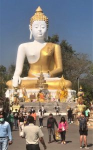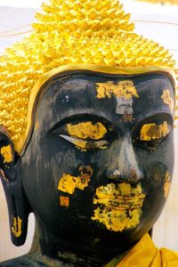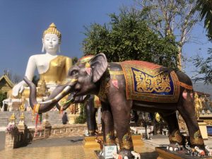 Es ist eine fantastische Tempelanlage hoch über Chiang Mai. Eine halbe Fahrstunde ist der Wat Doi Kham von der Stadtmitte entfernt, doch ist man erst einmal da, bleibt nur noch ein WOW! Kaum zu glauben, dass der Großteil dieses architektonischen Juwels schon 687 gebaut worden sein soll. Der stehende Buddha (links im Bild) kam erst sehr viel später dazu. Für die überwiegend thailändischen Besucher bleibt der 17 Meter hohe sitzende Buddha die eigentliche Attraktion.