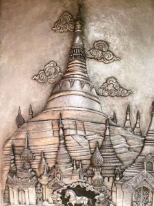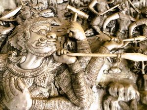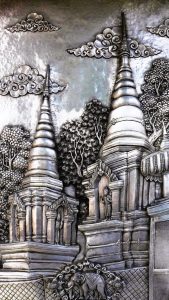Wie in fast allen buddhistischen Tempeln, so finden wir auch im Wat Muen San an den Wänden Szenen aus der buddhistischen Folklore und aus dem Ramayana-Epos. Normalerweise zieren Gemälde die Tempelwände, hier aber wurden die Kunstwerke in Silber gehämmert. In beiden Silbertempeln Chiang Mais handelt es sich nicht immer um reines Silber, das wäre zu teuer gewesen. Daher wurden dem Metall manchmal Aluminium oder Nickel beigemischt.