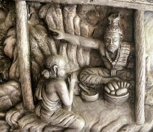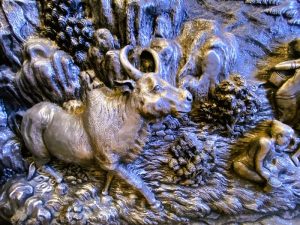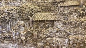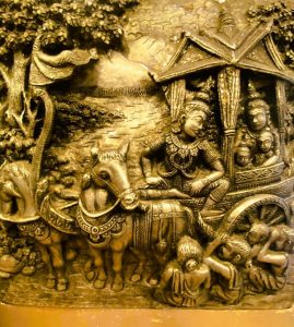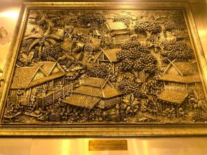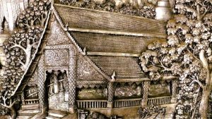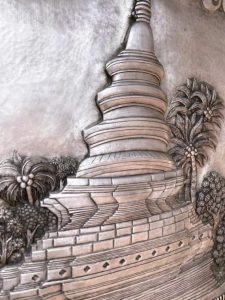 Wir entdecken ein Auto, das bergan durch den Wald fährt, der Form nach ein Vorfahre des ersten Mercedes G-Models vielleicht. Die Menschen am Wegesrand grüßen mit dem Wai, im Wagen scheint eine hochrangige Persönlichkeit zu sitzen. Wie gerät ein motorengetriebenes Fahrzeug ins Relief eines Tempels, der 1438 erstmals erwähnt wurde? Die Antwort überraschte auch mich. Alle Arbeiten in der Galerie wurden zwischen 2002 und 2010 durch hochbegabte Silberschmiede aus der Nachbarschaft gefertigt. Es ist also gar nicht lange her, dass aus einem normalen Tempel ein ganz besonderer wurde.