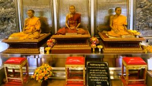 Im Inneren der Galerie sitzen drei Mönche, geformt aus einem speziellen Wachs und, wie so oft, erschreckend lebendig wirkend. Unter dem Baum der Erleuchtung sitzt ein weiterer Mönch, dem sich gerade die Erkenntnis aufdrängt, dass er deutlich zuviel gegessen hat (Fotos Faszination Fernost/B. Linnhoff).