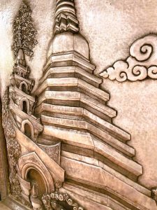 An der rechten Außenwand sehen wir zwölf rechteckige Kunstwerke, eine Auswahl der berühmtesten Chedis in Thailand und den Nachbarländern, darunter die Shwedagon-Pagode (Yangon) oder der Tempel Pha That Luang (Vientiane). Im unteren Bereich der Reliefs wurde jeweils eins der zwölf Tierkreiszeichen eingearbeitet.