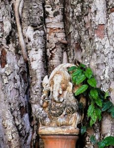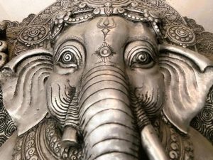 Ganesha (auch: Ganesh) begegnete mir gleich drei Mal. Am Baum, dreidimensional in Silber und in voller Pracht nahe dem Ubosot. Dem hinduistischen Elefantengott fühle ich mich besonders verbunden, ist er doch der Schutzpatron der Schreibenden und der Reisenden. Leider ist der Multitasker damit nicht ausgelastet, daher wirkt er auch als Gott der Hindernisse, die er nicht nur zerstört, sondern auch aufbaut. Er ist als Götterbote und als Wohltäter unterwegs und vermittelt Arbeit. Soviel zu seinen Haupttätigkeiten.